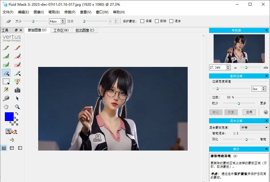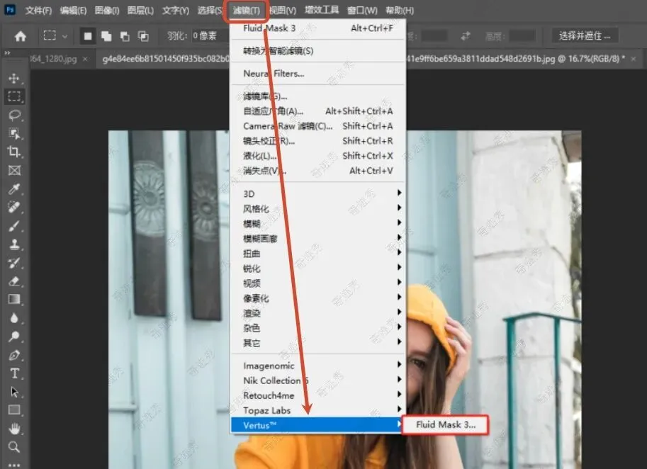 操作步骤十分简单,首先在PS中打开需要抠图的照片,点击菜单栏的滤镜-Vertus-Fluid Mask,即可打开软件独立操作窗口。
