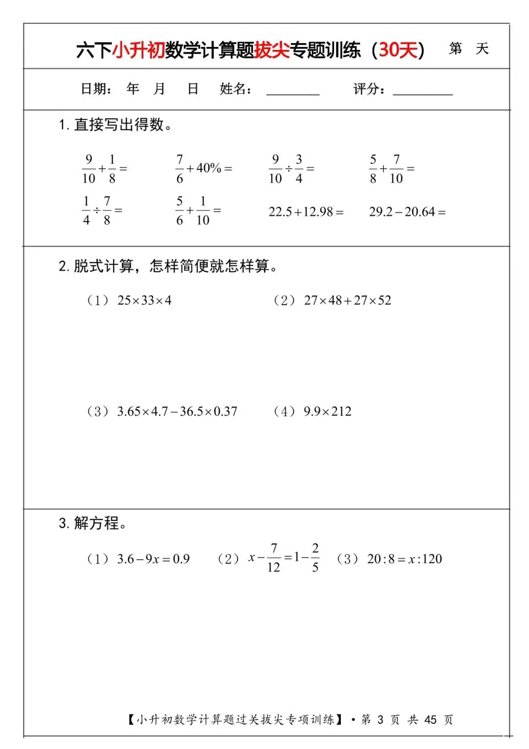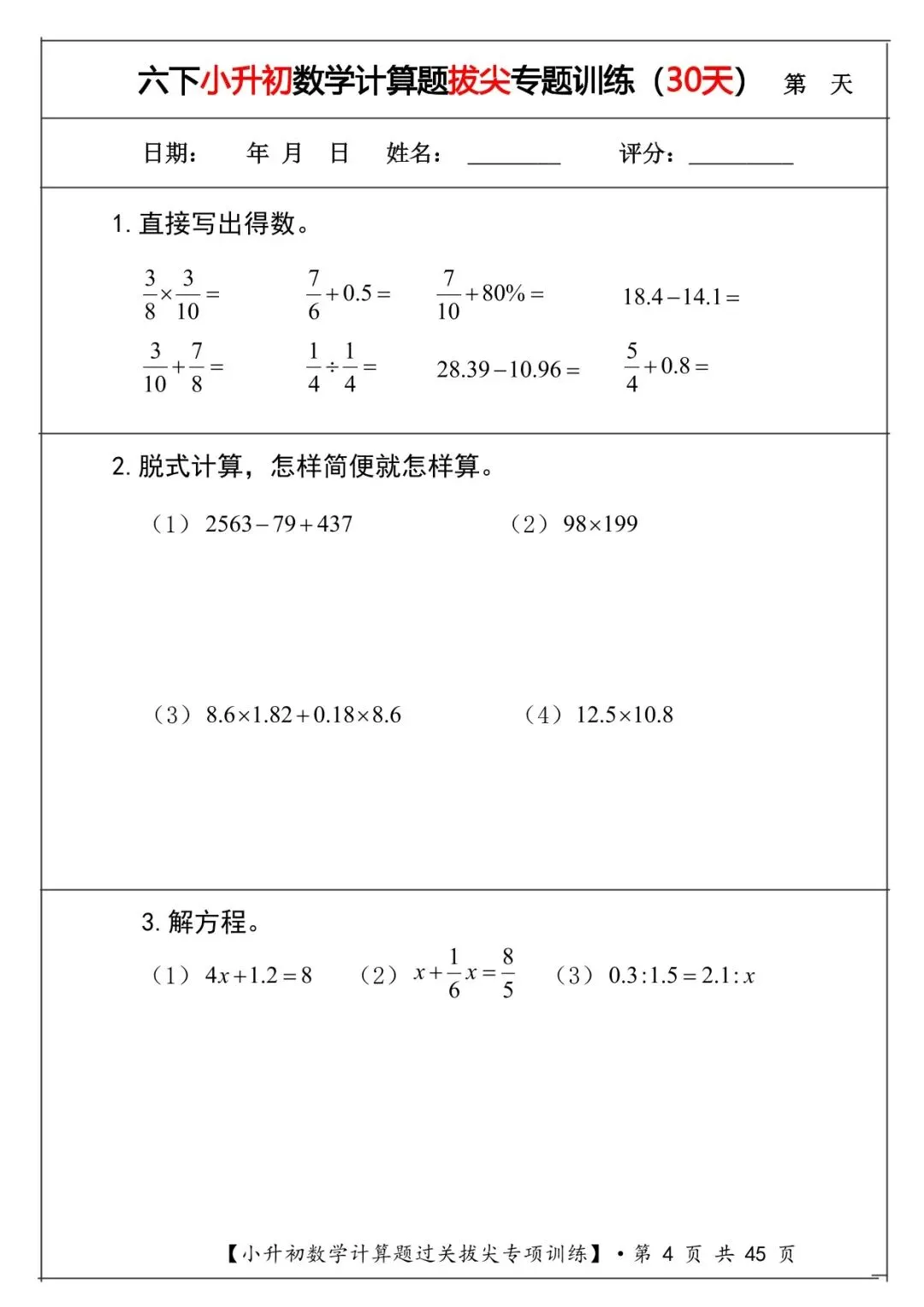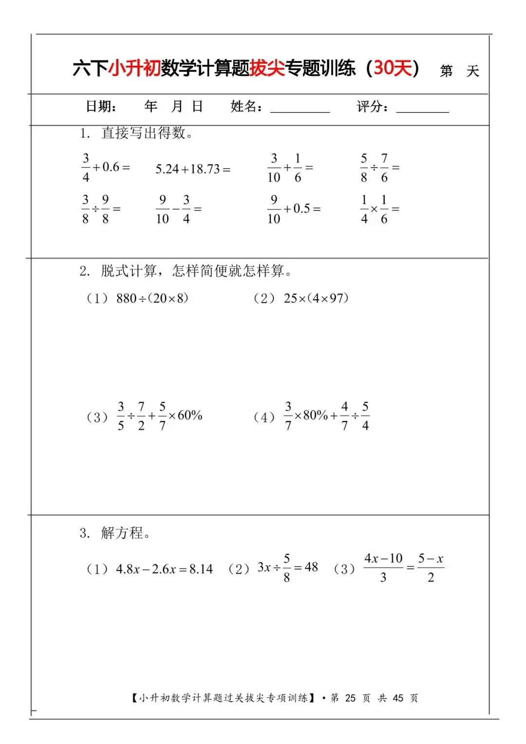 可下载丨六年级下册数学小升初计算题拔尖专题训练(共30天),电子版可打印