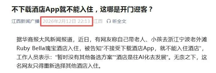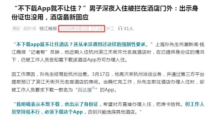 (因为文章发表于新闻报道之后,存在相关酒店已经取消了非app渠道消费者不下载安装app无法办理入住的限制的可能,但根据新闻报道中酒店方的态度推断,这种可能得概率微乎其微)