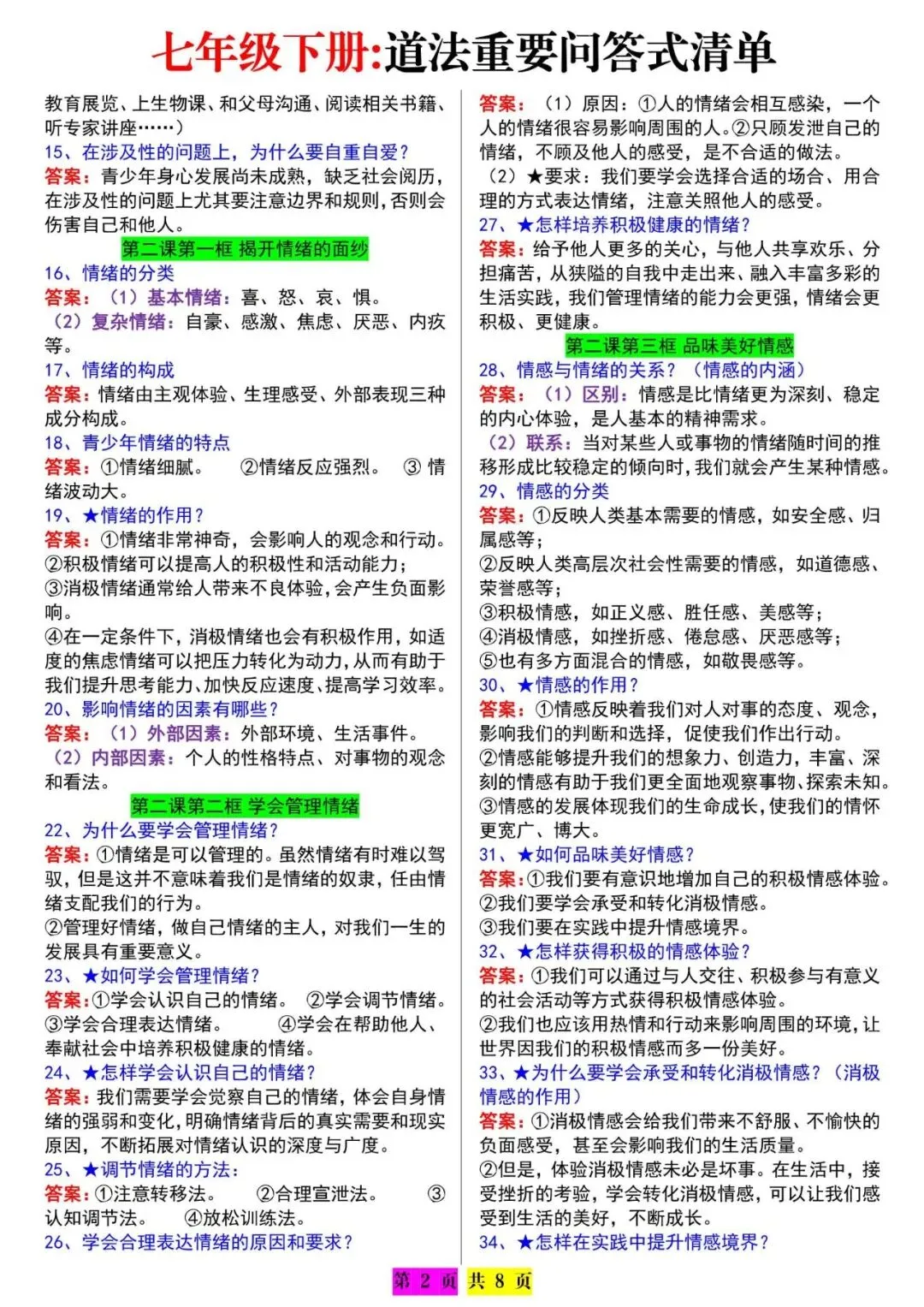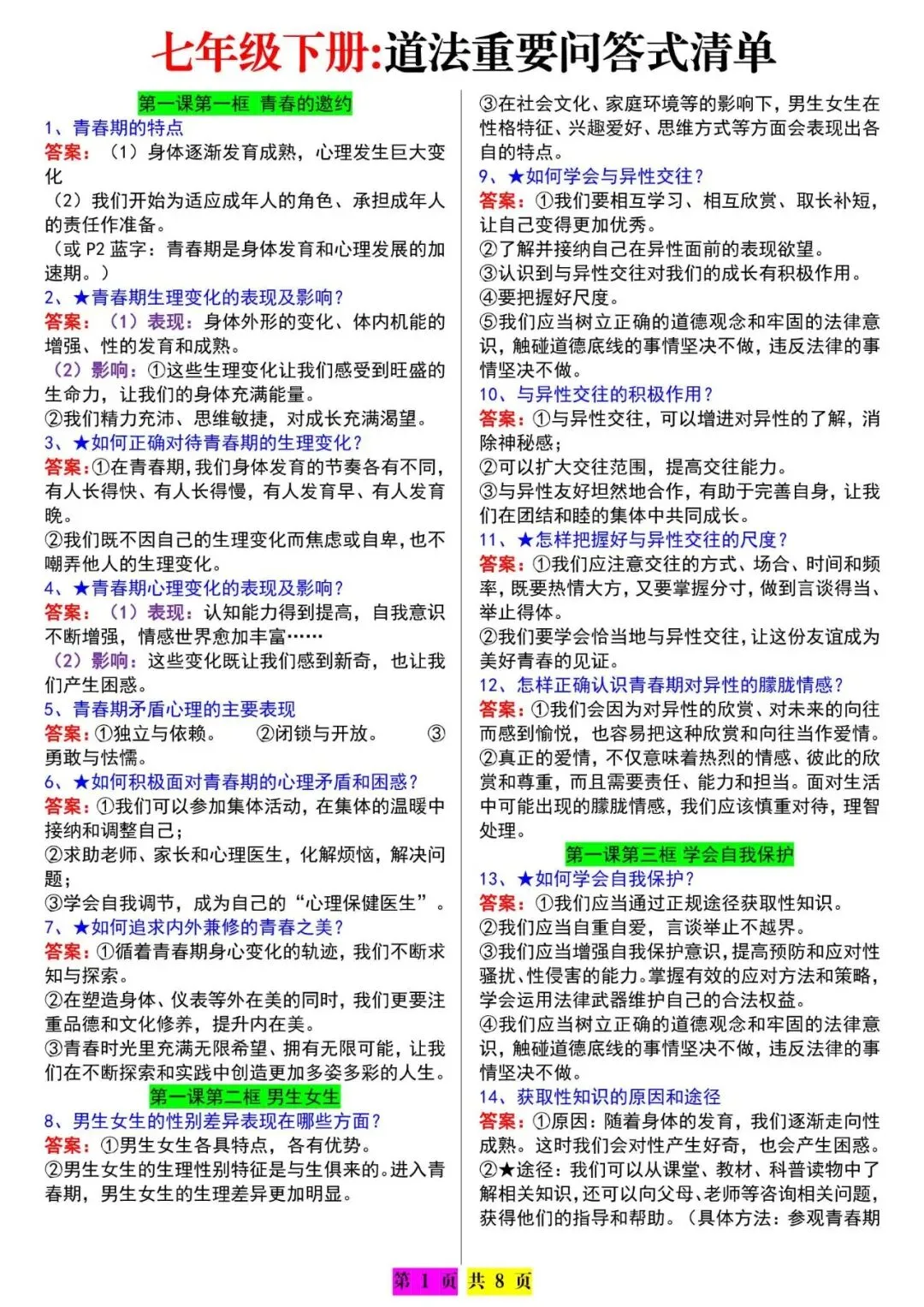 七下道法期末必背:问答式知识点汇总,电子版可打印!