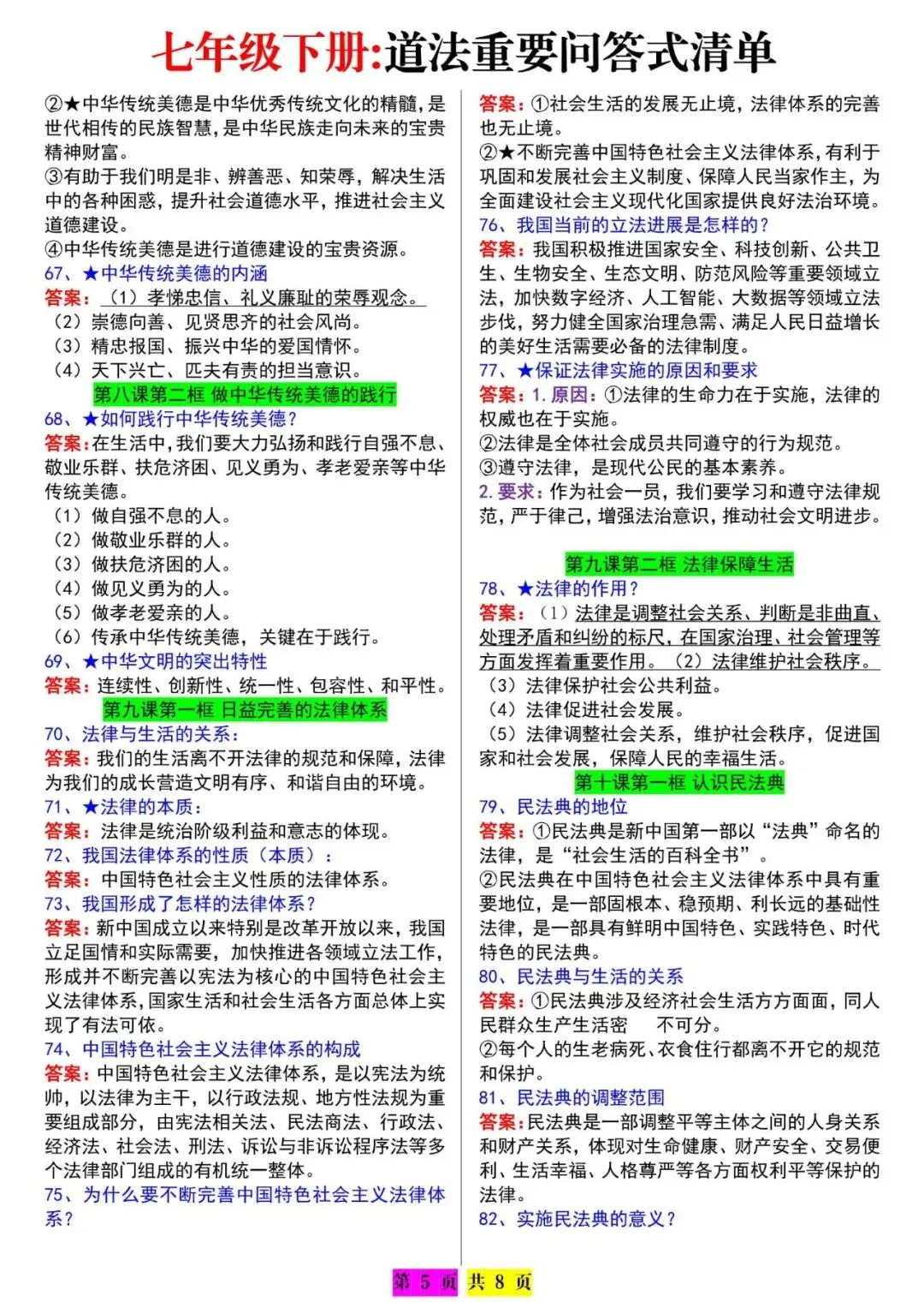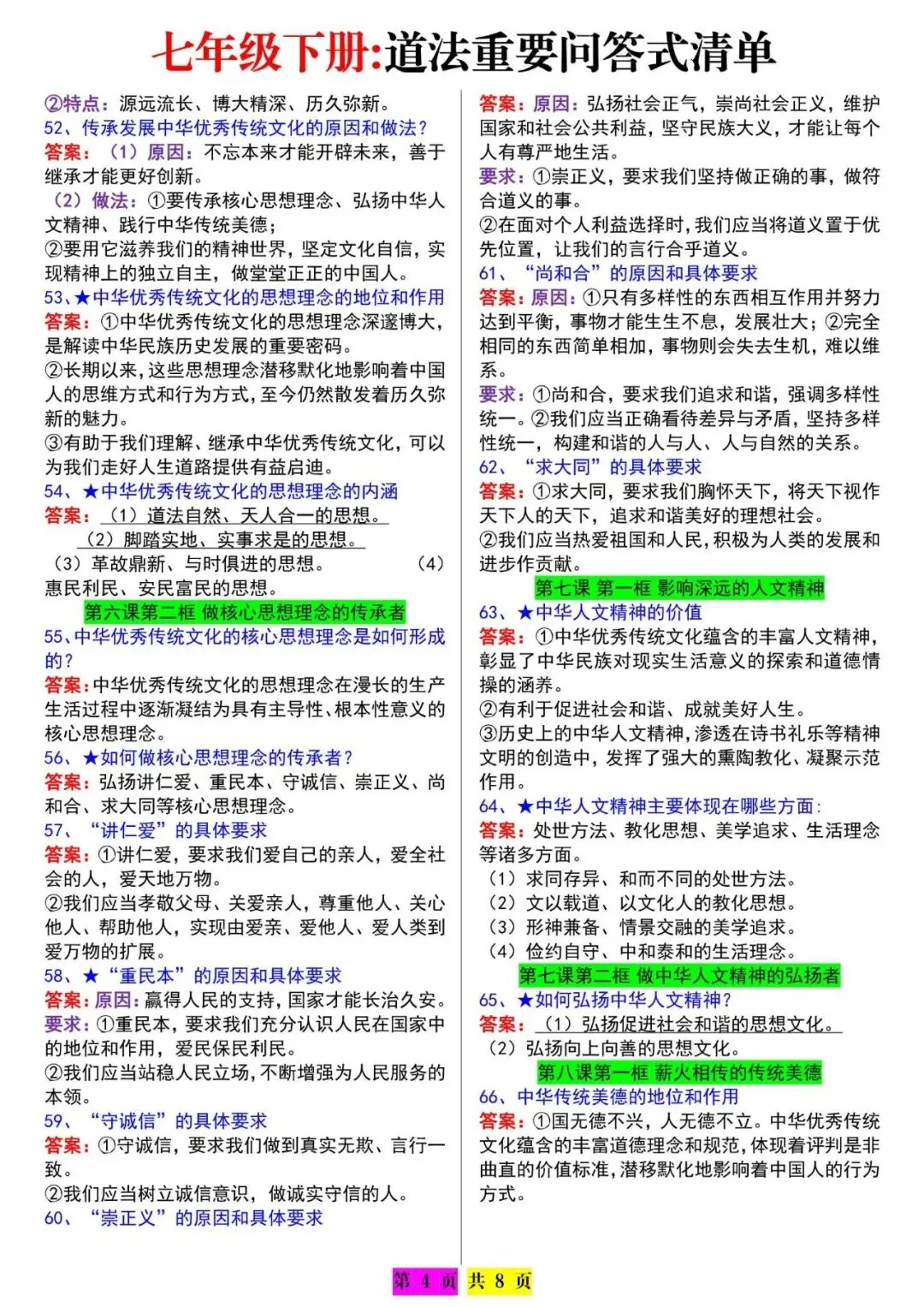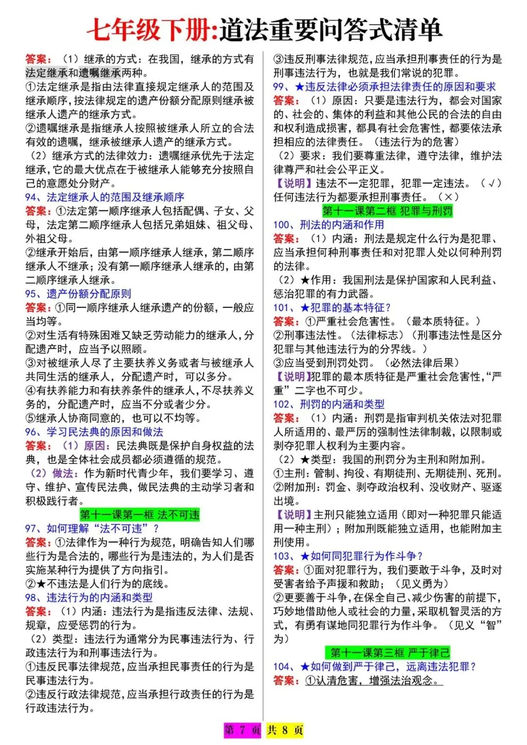 今天老师给大家整理了:七下道法期末必背:问答式知识点汇总,电子版可打印!