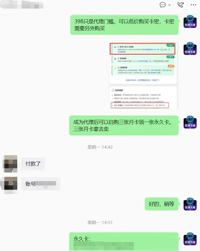 极低的准入门槛与高额利润空间。玫瑰克隆的代理方案以“合伙人模式”为核心,合伙人权限仅需398元即可开通,且合伙人拿卡价可低至每月10元。这意味着代理可以远低于官方零售价的价格批量拿卡,转手以市场价出售,赚取丰厚的渠道差价。无论是面向个人博主进行零售,还是与企业MCN机构进行大批量团购,代理模式都提供了极大的利润想象空间。