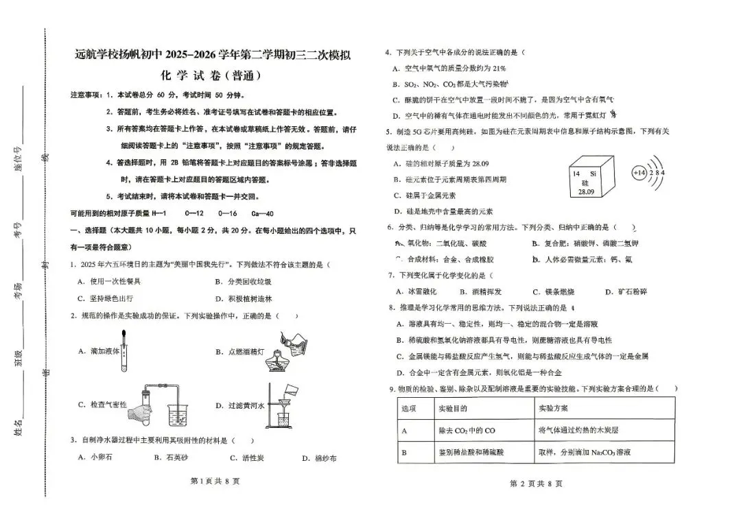 2026年邯郸市扬帆中学九下二模化学试卷
