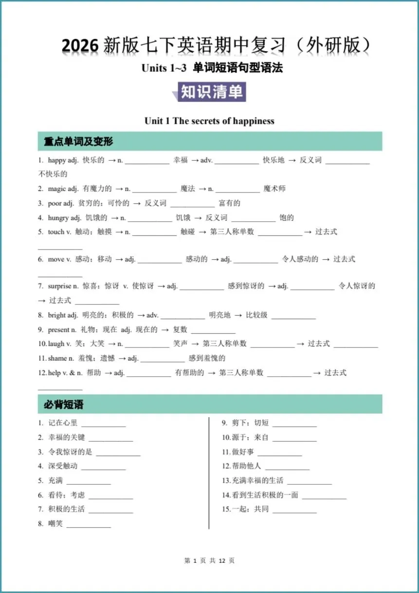 2026春新(外研版)七年级下册《英语》Unit1-3英语全套复习资料:含单词短语句型语法写作(背诵+默写版),电子版可下载打印!