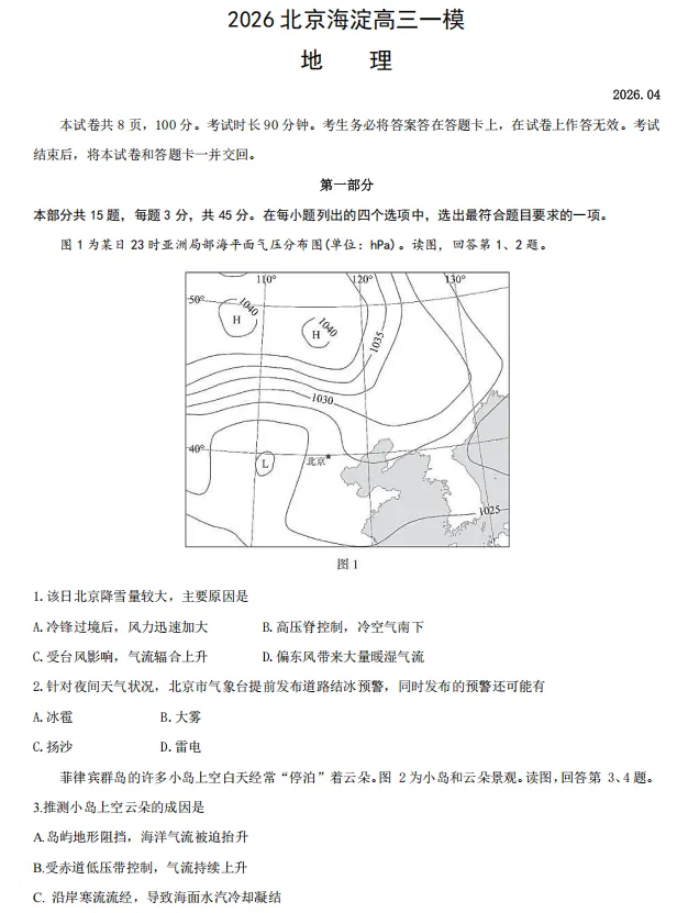 小编整理了2026年北京市海淀区高三一模地理,PDF版!可以参考练习。
