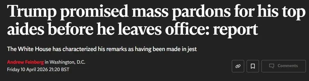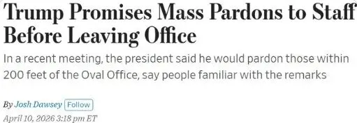 4月10日,媒体报道称特朗普在一次“最近会议上”承诺,将在卸任前大规模赦免团队成员,包括高级政府官员和幕僚。