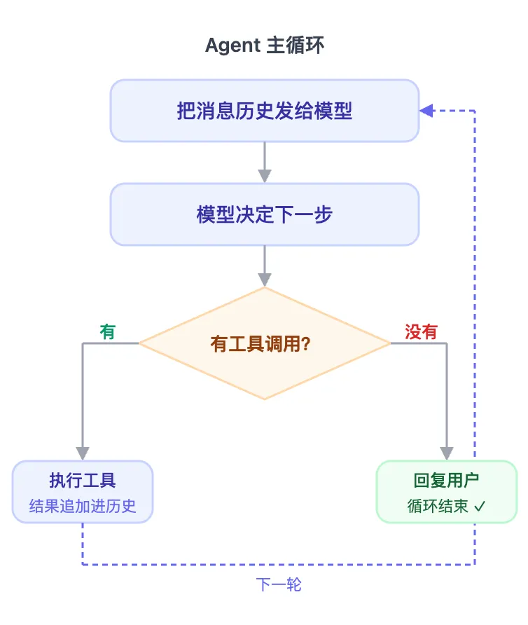 这个一轮一轮协作的骨架,就是一个Agent主循环。也就是这篇文章要讲的核心。理解了这个主循环,你也就理解了Agent最核心的概念,之后其他的概念都是在这个基础上去延展的。