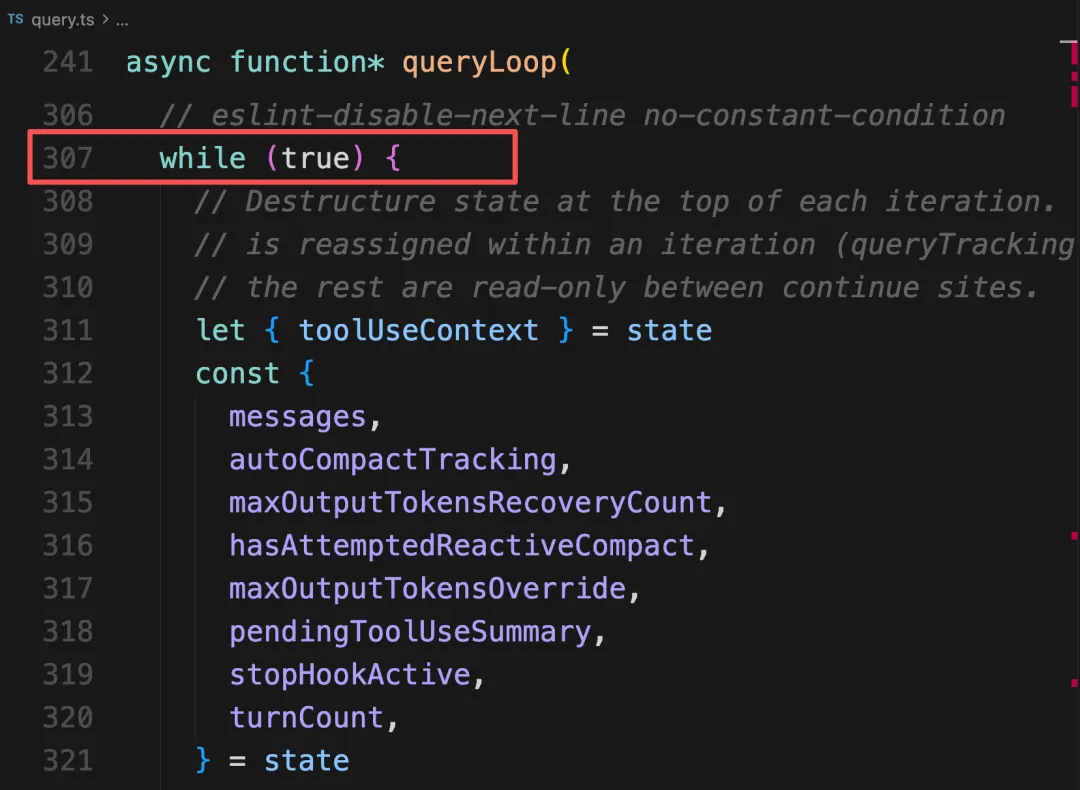 打开 Claude Code 的源码,query.ts 文件的第 307 行,就是这个循环的起点: