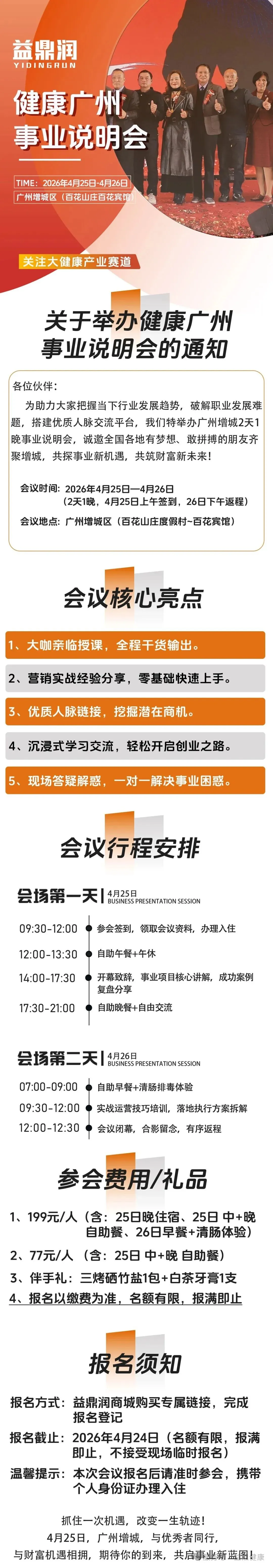 「聚力增城 筑梦前行」——广州事业说明会邀请函 益鼎润广州事业说明会 紧跟时代行业浪潮 解锁职业发展新可能 汇聚同道精英 共话商机! 益鼎润特在广州增城区 举办2天1晚事业说明会 会议时间:2026年4月25日-4月26日 诚邀全国有梦想敢拼搏 勇于进取的伙伴们相聚增城 共探事业新机,共赴财富新程!