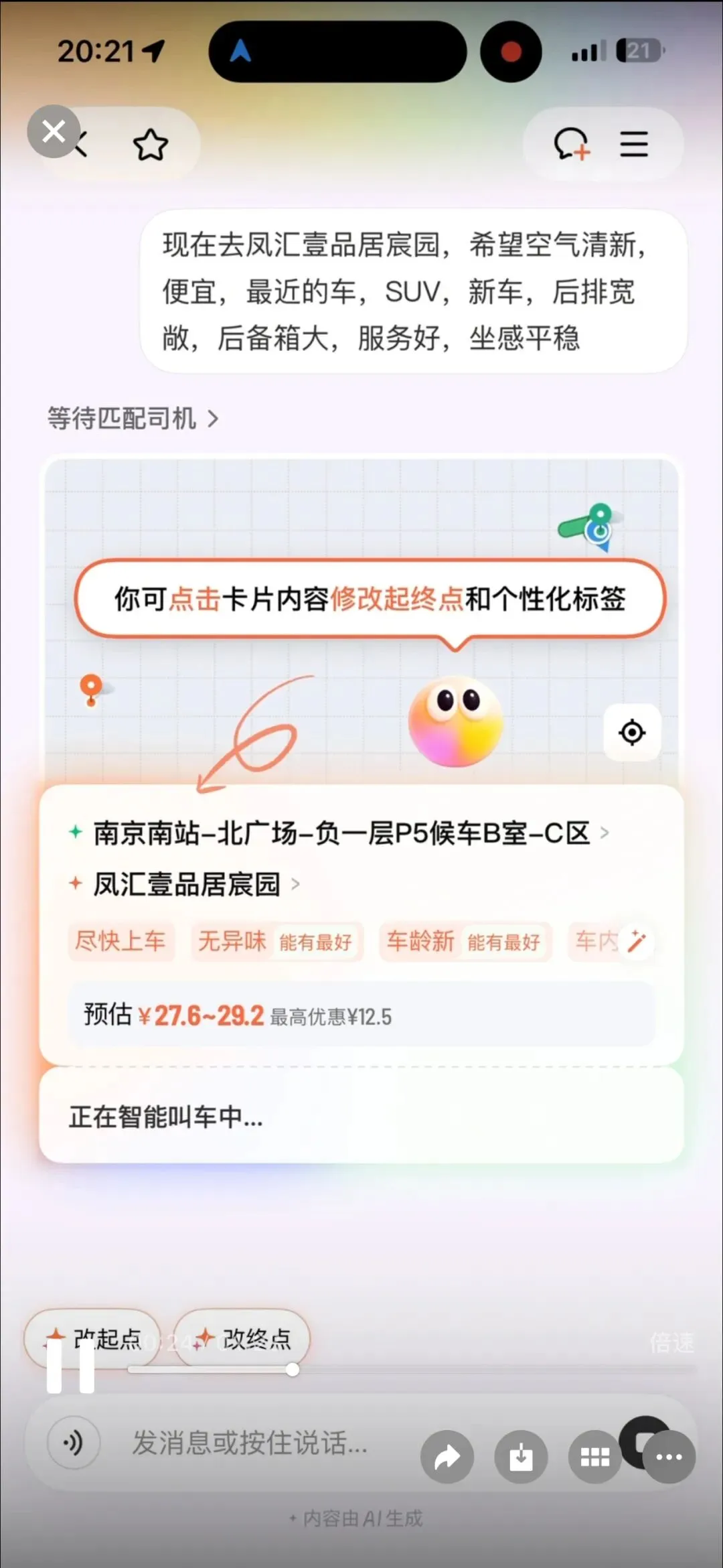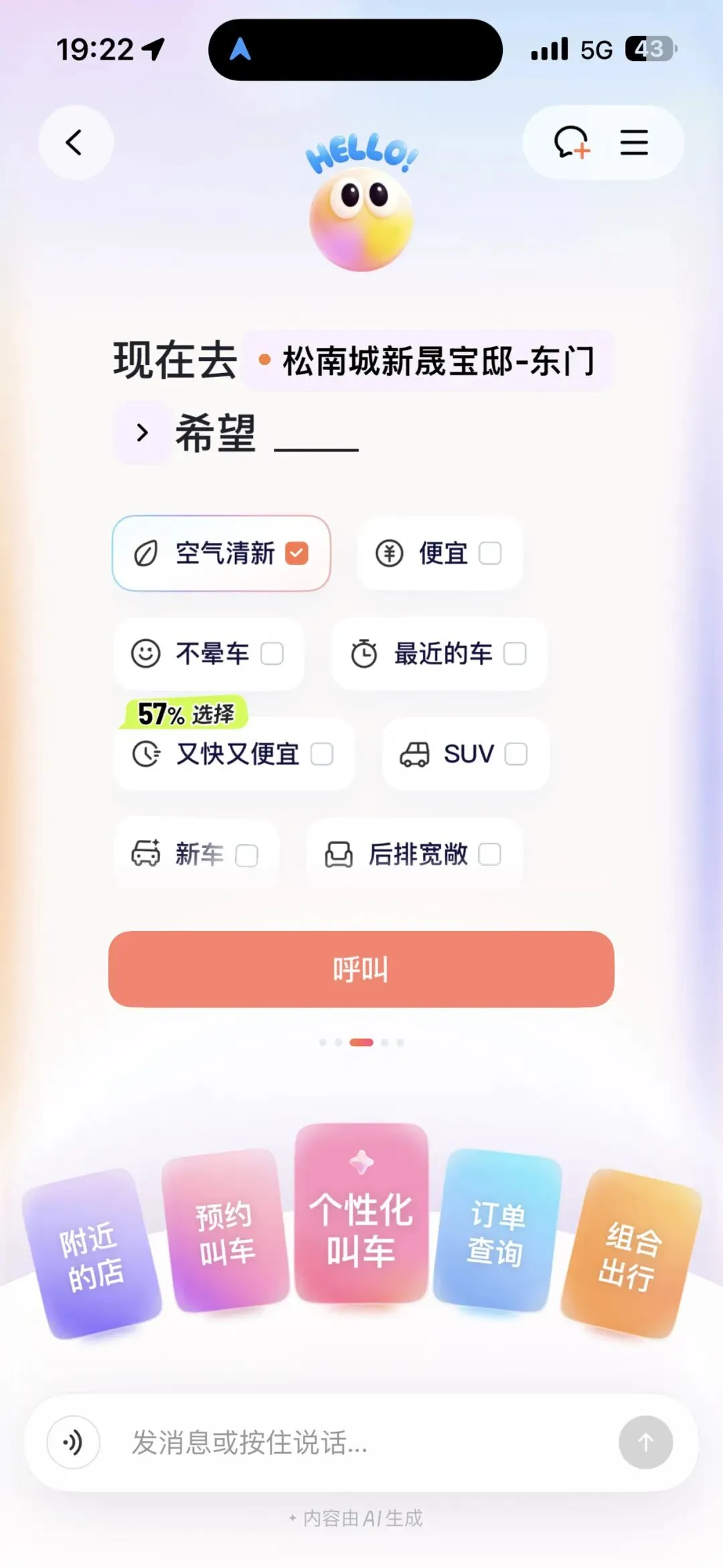 刚从上海学完AI回来,下了高铁我就迫不及待试了一把AI DD助手叫车——从点开那个圆滚滚的AI助手图标,到直接说出我的要求:要空气清新、便宜、SUV、新车、后排宽敞、后备箱大、服务好、坐感平稳,全程我连一个字都没手动输入,全靠AI帮我搞定。