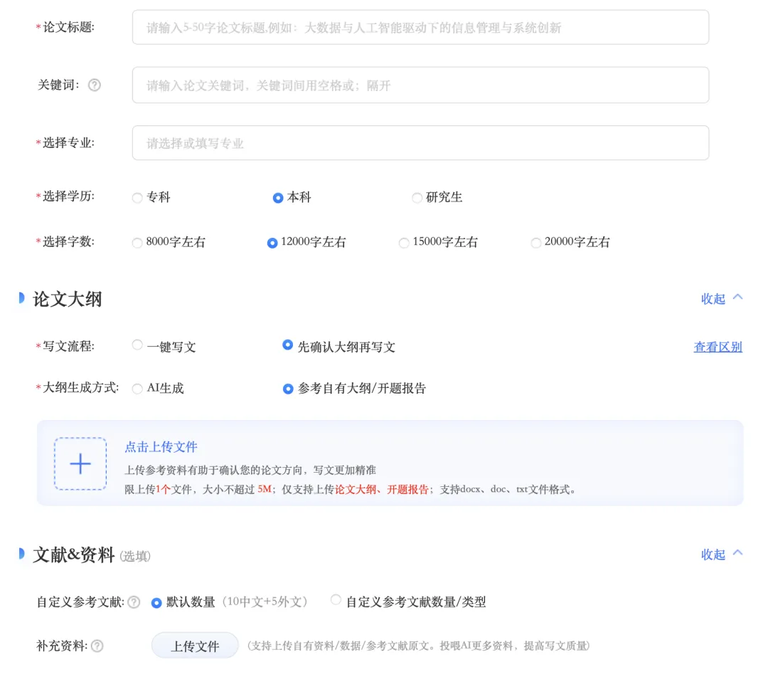它会根据你的专业、学历、开题报告,甚至你自己上传的实验数据、调研材料来创作。