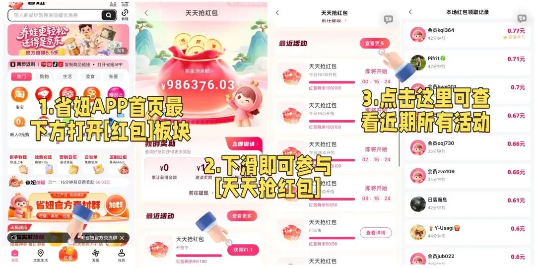 打开省妞APP → 点击最下方【红包】板块 → 下滑即可参与每小时拼手速抢红包