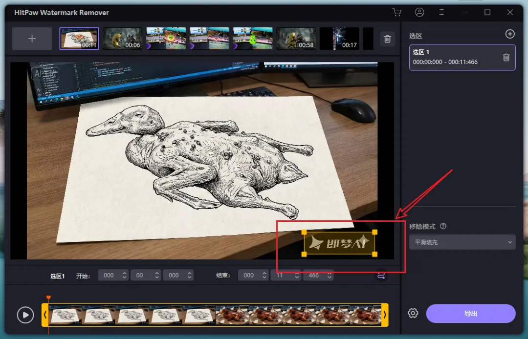 4.如果视频有两处以上水印,就需要一次一次去除,先去除一处水印,导出视频,再把导出的视频导出软件,去除其他地方的水印即可。