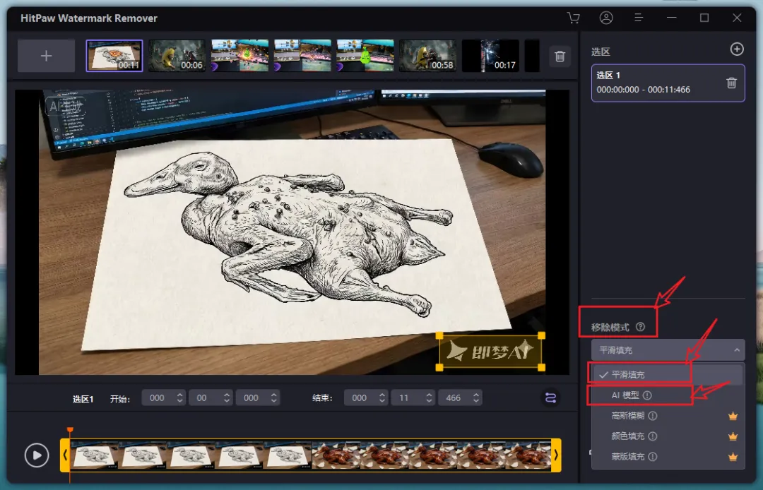 3.选择移除模式。平滑模式和AI模型模式都是可以免费使用的,下面可以看到两个模式的效果,感觉都还可以。