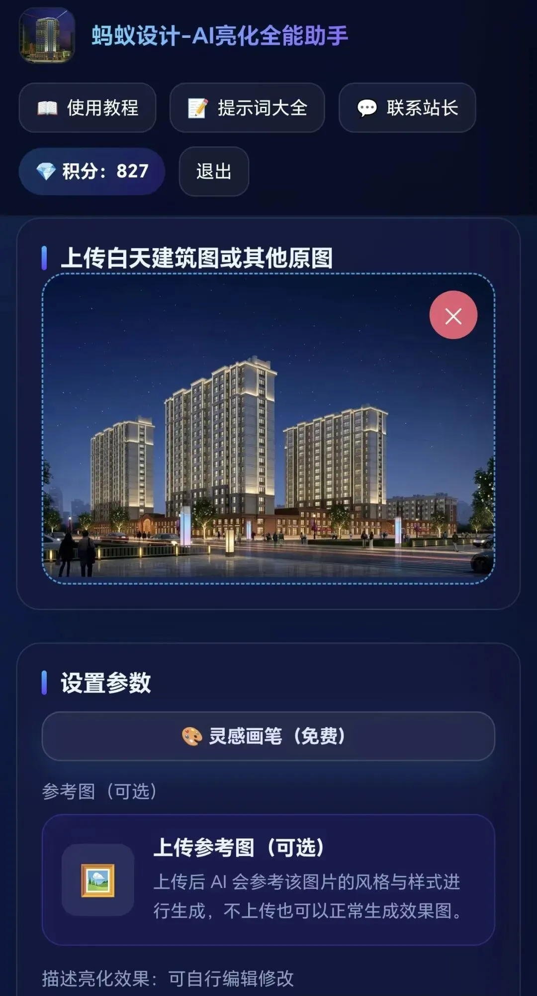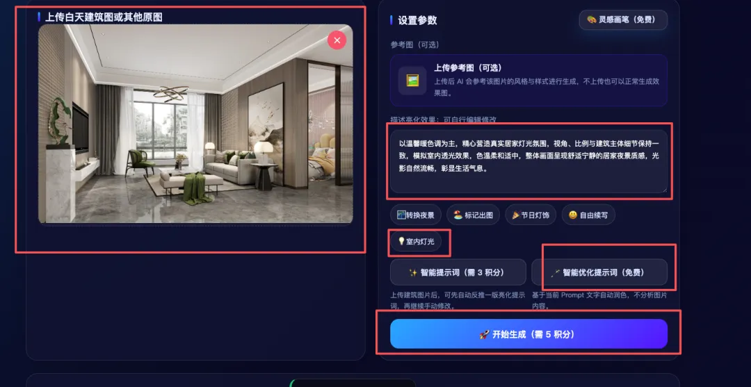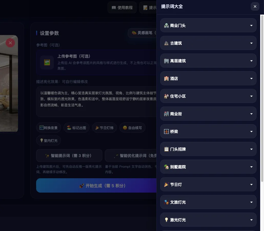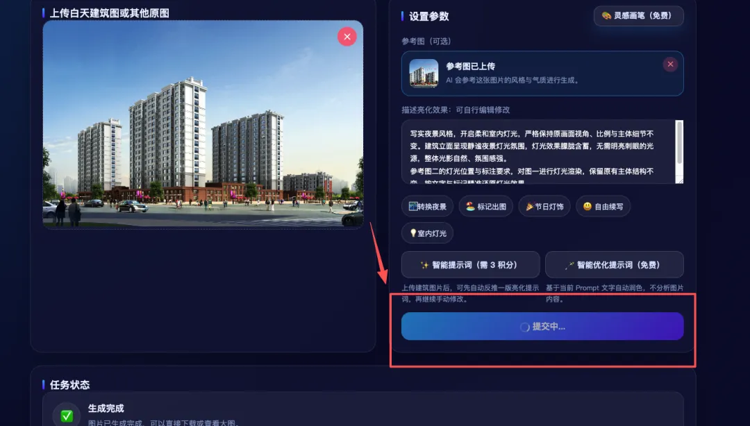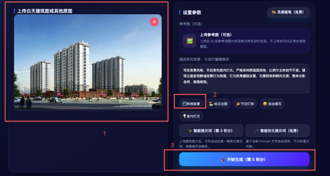 一键转夜景,标记出图,编辑图片,手机即可完成,随时谁地出图,快至30S即可生成夜景效果图,改方案随时编辑再次生图即可。
