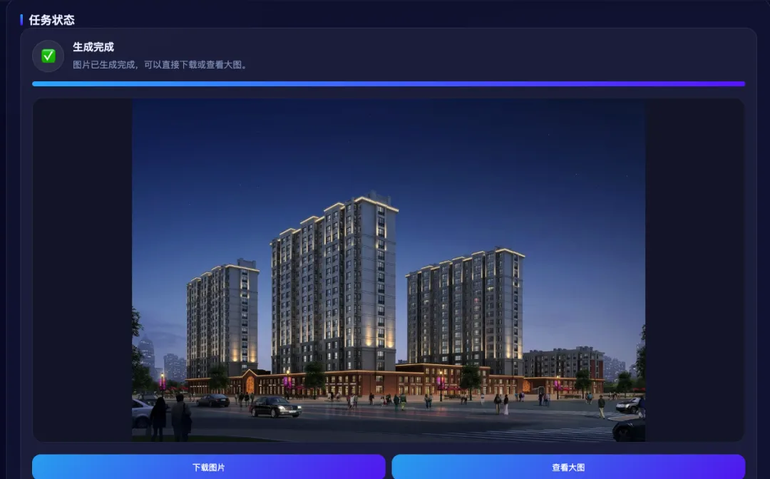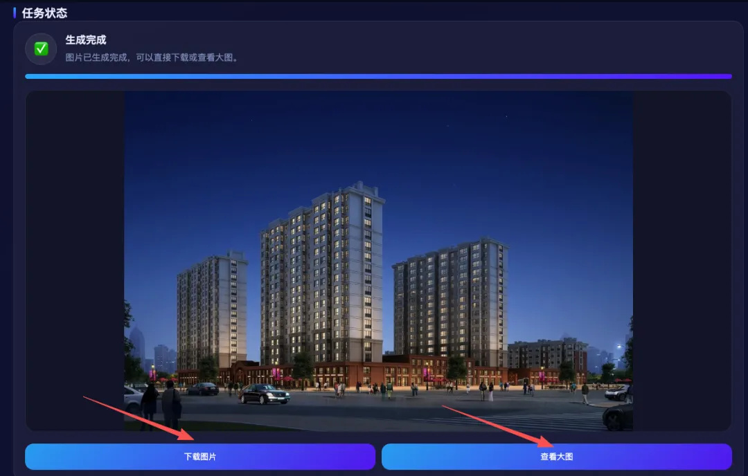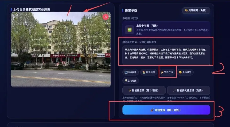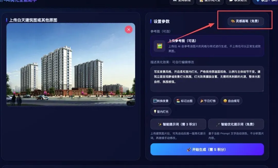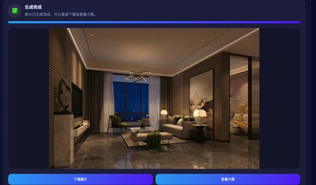 一键转夜景,标记出图,编辑图片,手机即可完成,随时谁地出图,快至30S即可生成夜景效果图,改方案随时编辑再次生图即可。