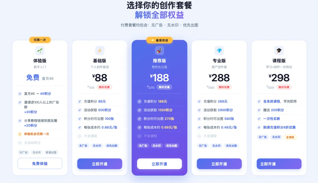 由于出图需要计算机算力支持,模型付费,网站维护等,为了网站持续为大家提供优质服务,需要进行充值积分出图。目前是出图一张需要消耗5个积分,充值费用如下:体验版可做活动免费限时领取一次积分或直接充值积分,点击下面图放大查看详情。