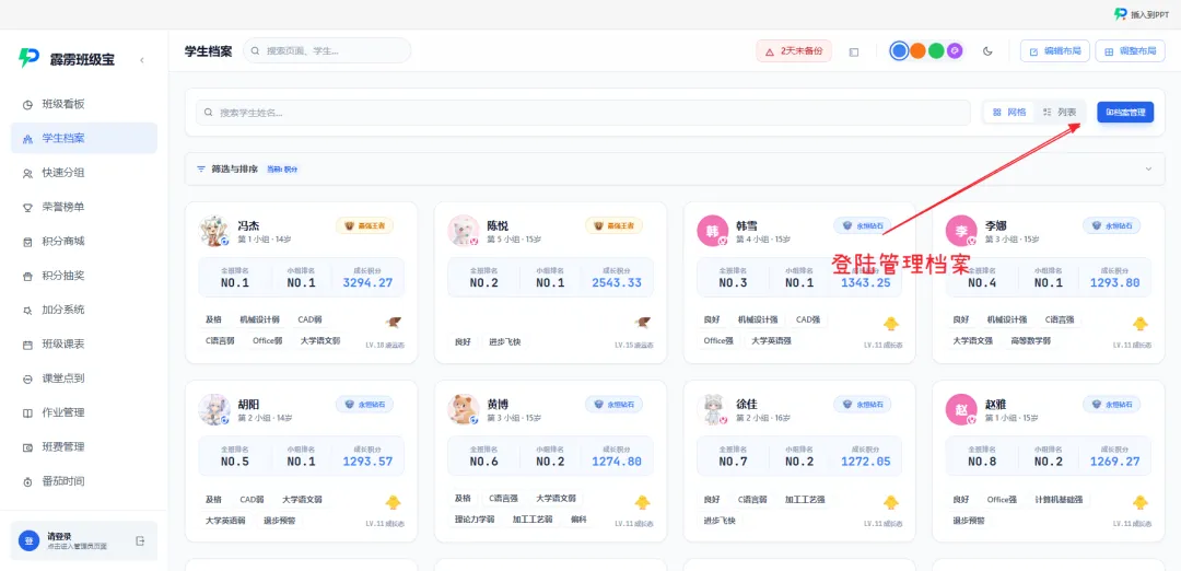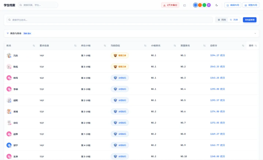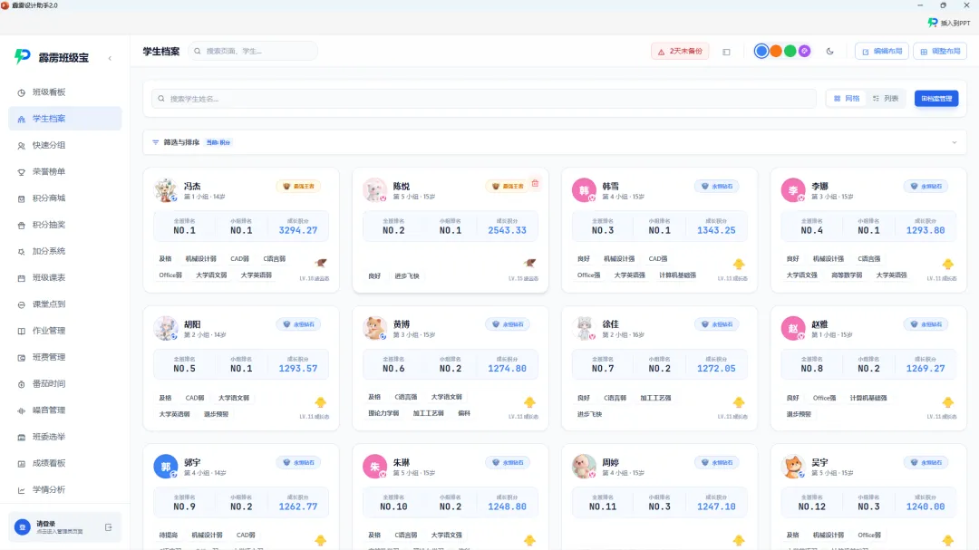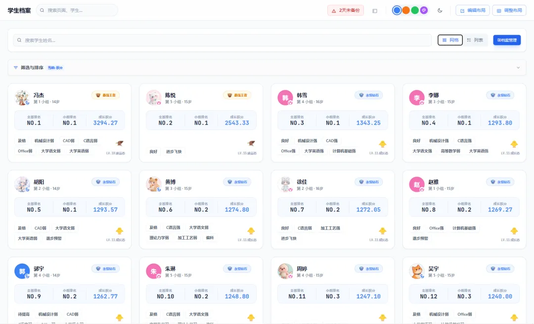卡片式概览:学生档案页面默认展示所有学生的档案卡片,每张卡片包含基础信息(姓名、学号、性别)、积分段位、关键自定义字段(如 “贫困生 – 是”“特长 – 体育”),一眼就能掌握核心情况;
