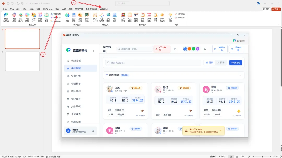 第一步:PPT 里集中管理所有数据,打开班级电子白板的PPT软件,点击菜单栏「霹雳设计助手」,登录老师模式后