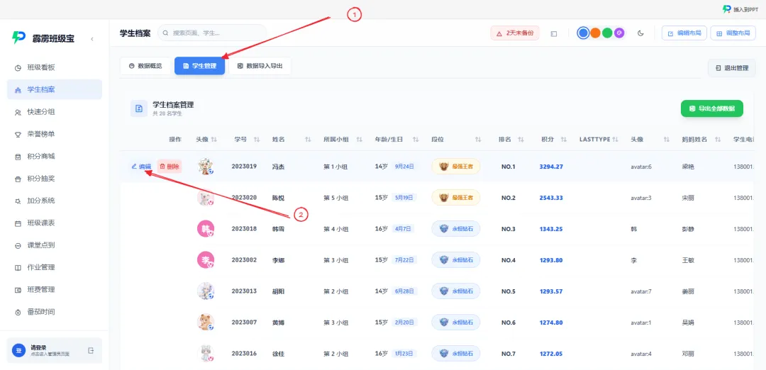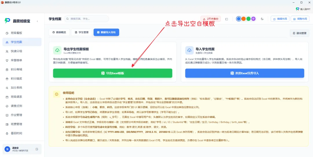 期末一键导出:期末需要统计学生综合情况时,点击「档案管理」→ 「数据导入导出」→ 「导出模板」,一键下载包含所有学生信息(基础信息、自定义字段、积分段位、学科标签)的 Excel 表格,直接用于期末总结、综合素质评价,不用再手动整合多个表格;