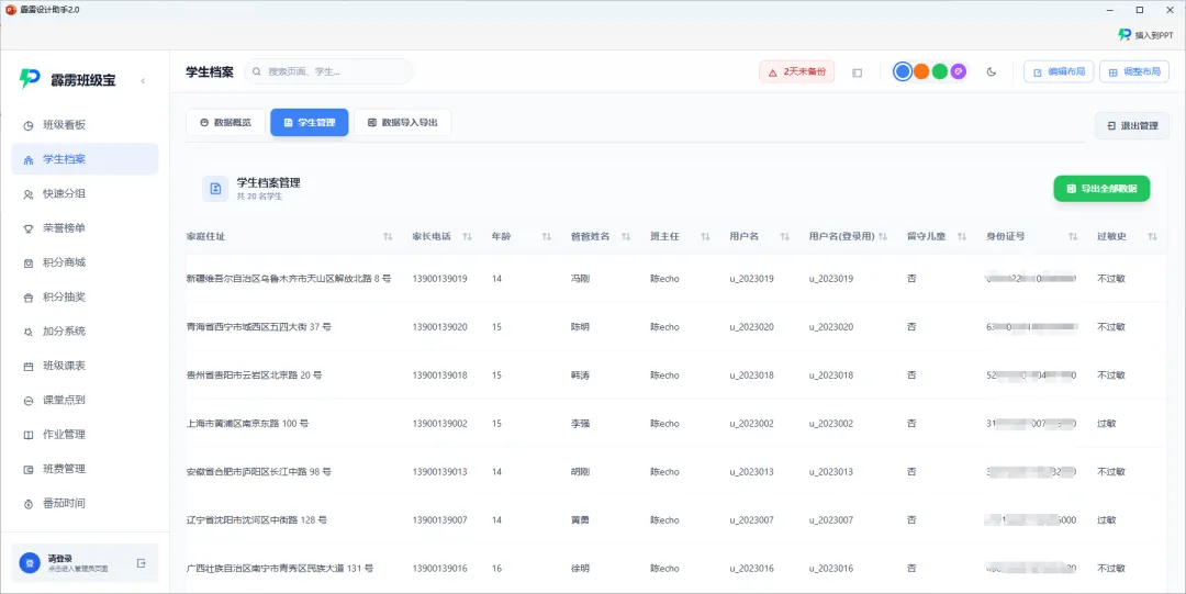 我们保证您的所有数据离线存储杜绝泄露:所有学生数据(包括身份证号、家庭住址、贫困生信息等敏感内容)均离线存储在本地设备,不上传云端、不流入第三方,彻底杜绝数据泄露风险,完全符合《个人信息保护法》对未成年人数据的保护要求;