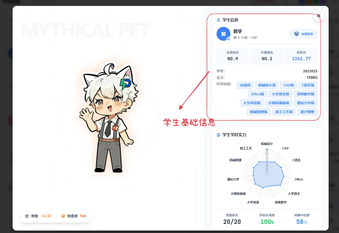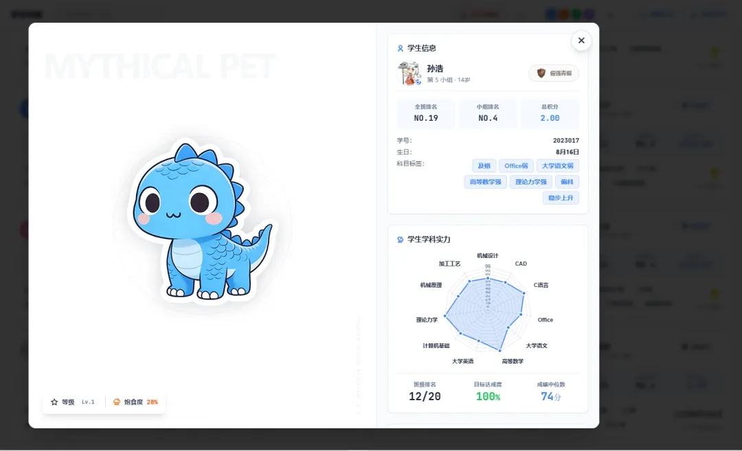 点击学生档案卡片,弹出详情弹窗,像分析游戏角色一样查看全维度指标:基础信息:姓名、学号、年龄(由出生日期自动计算)、联系方式等;