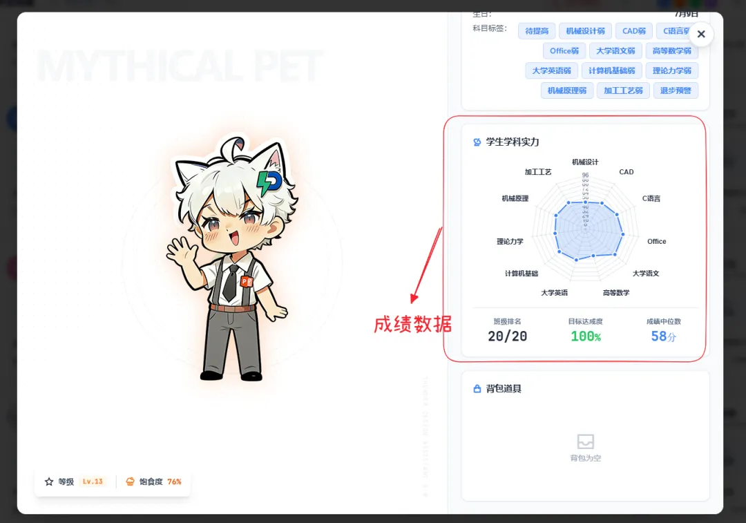 学习数据:学科标签(由成绩看板联动生成,如 “数学优秀”“英语待提升”)、积分记录(由加分系统同步,含作业、课堂表现等加分明细);个性信息:特长、特殊情况备注、助学金申请记录等;