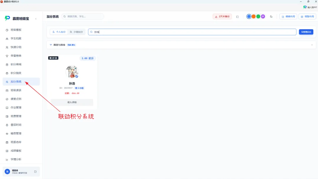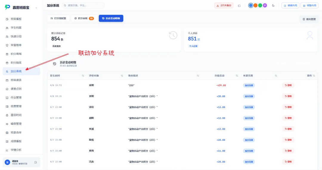 联动加分系统:学生的积分、段位实时更新,在档案详情中可查看积分变动明细;