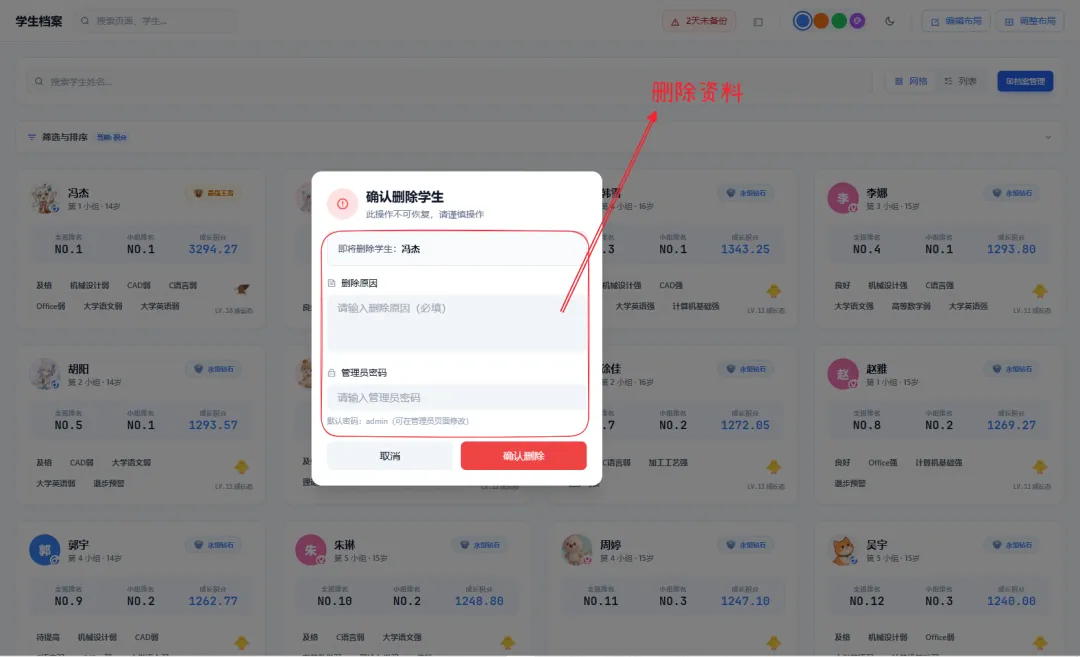删除操作留痕:如需删除学生档案,需输入管理员密码 + 填写详细删除原因,且删除操作不可逆,删除前系统会提示备份数据,避免误删导致数据丢失;