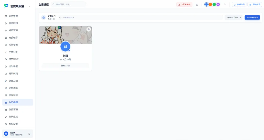 联动生日祝福:档案中的出生日期联动生日祝福功能,自动提醒即将过生日的同学,方便组织庆祝活动;