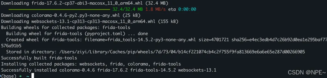 # 确保已安装 Python 环境,使用 pip 安装:# 推荐指定版本安装(PC 端和手机端版本保持一致,以保证稳定性):pip install frida==17.6.2 frida-tools# 安装最新版# pip install frida frida-tools