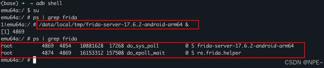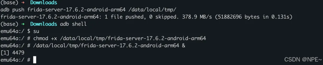 # 1. 推送到手机临时目录adb push frida-server-17.6.2-android-arm64 /data/local/tmp/# 2. 进入手机 Shell 并提权adb shellsu# 3. 赋予执行权限并后台运行chmod +x /data/local/tmp/frida-server-17.6.2-android-arm64/data/local/tmp/frida-server-17.6.2-android-arm64 &## 如果要退出Frida hook,执行exit命令即可