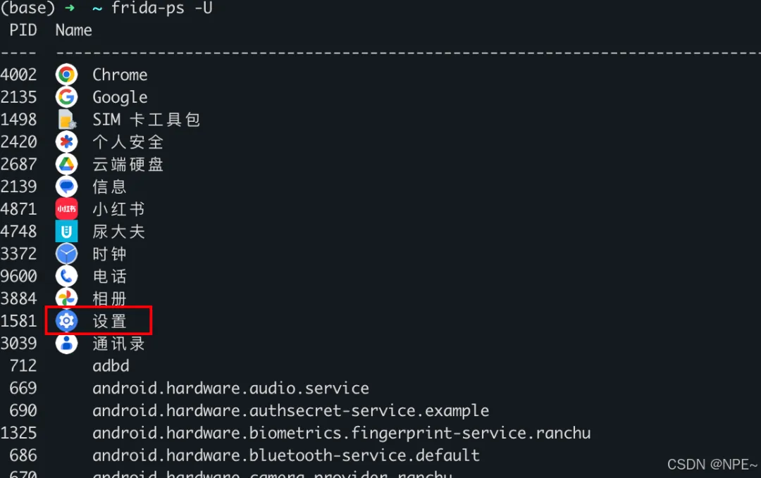# 本地mac执行下面命令,列出已连接的设备frida-ls-devices# 查看当前手机上活跃的进程frida-ps -U