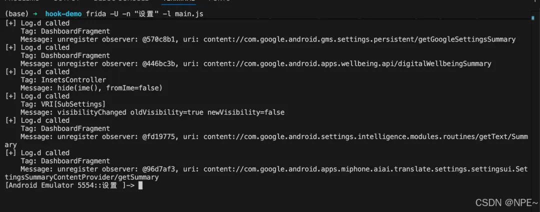 # 终端执行下面命令,进行hook。然后点击任意子模块,比如【通知模块】等frida -U -n "设置" -l main.js