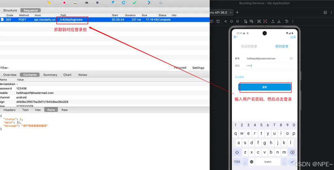 下面我们将以“尿大夫”App登录接口为例,我们先用抓包反编译定位到 sign 字段的生成算法(静态分析),再用抓包逆向编写Frida脚本动态Hook该算法,验证其输入输出,甚至篡改签名(动态分析)。