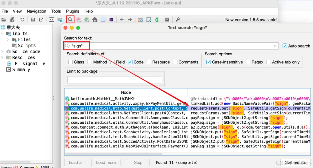 • 主要是这个sign字段,所以我们全局搜索这个sign,这个sign字符是固定的,我们推测目标是一个map,且通过put方式设置到请求参数中