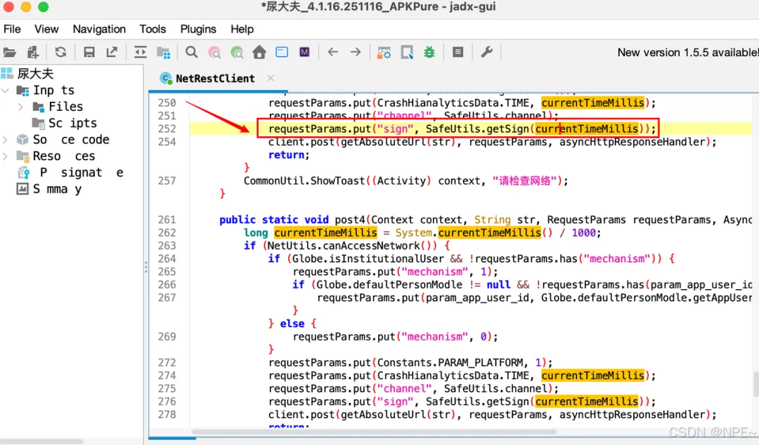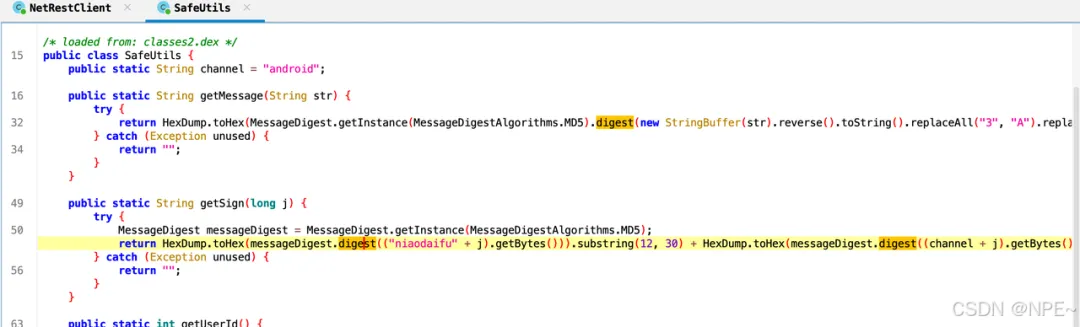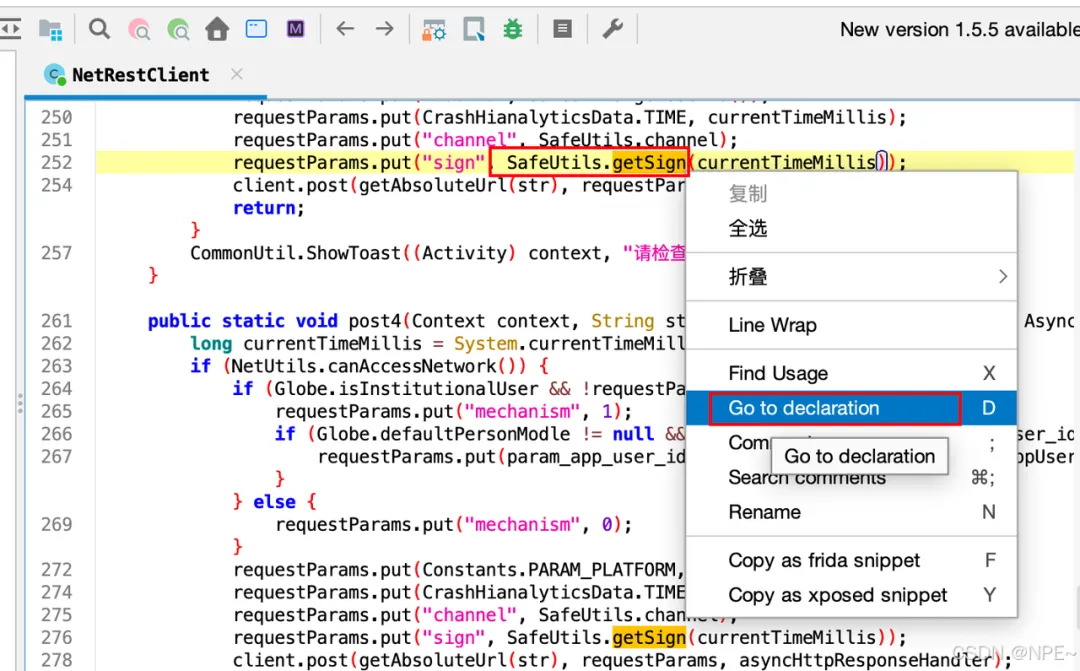 • 我们发现sign是通过SafeUtils.getSign方法获取到的,那么我们选中getSign方法,鼠标右键,点击跳转到方法声明处,查看底层实现逻辑
