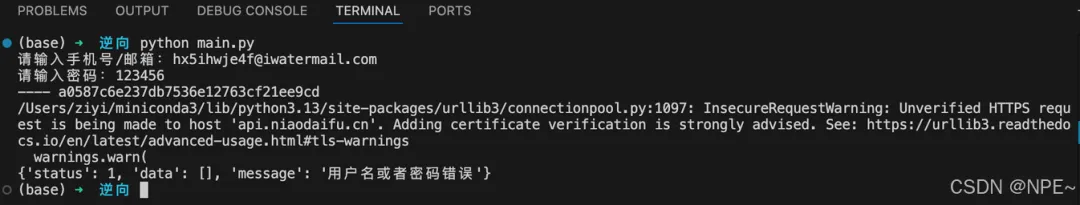 import requestsimport timeimport hashlibfrom urllib.parse import parse_qslchannel = "android"defgetSign(j):try: str1 = "niaodaifu" + str(j) md5_1 = hashlib.md5(str1.encode('utf-8')).hexdigest() part1 = md5_1[12:30] str2 = channel + str(j) md5_2 = hashlib.md5(str2.encode('utf-8')).hexdigest() part2 = md5_2[12:26]return part1 + part2except Exception:return""defquery_to_dict(query_string):returndict(parse_qsl(query_string))phone = input('请输入手机号/邮箱:')password = input('请输入密码:')sign = getSign(int(time.time()))print('----',sign)q = 'password=%s&mobile=%s&channel=android&sign=%s&time=%s&mechanism=0&platform=1' % ( password, phone, sign,int(time.time()))# 实现query转字典data = query_to_dict(q)res = requests.post('https://api.niaodaifu.cn/v4/site/loginnew', json=data, verify=False)print(res.json())