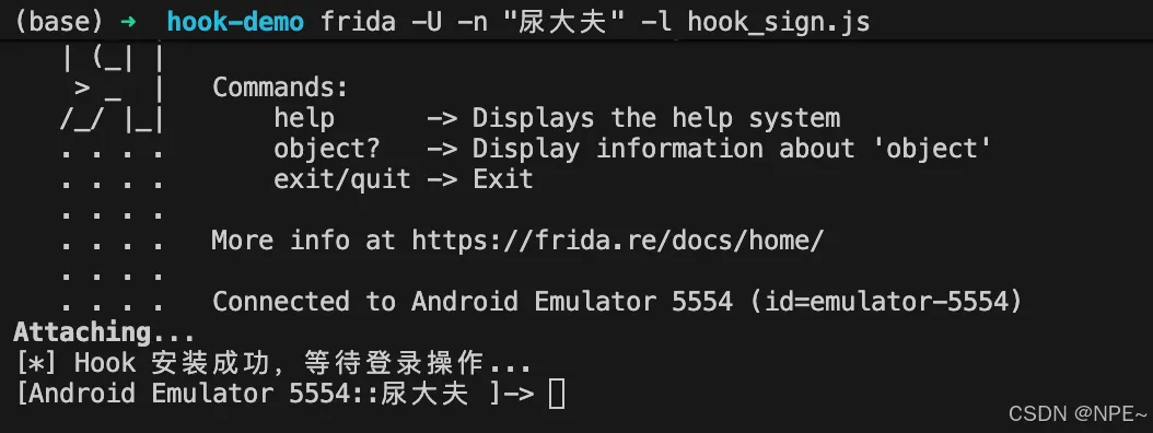 # 通过应用名定位frida -U -n "尿大夫" -l hook_sign.js# 或者通过包名进行hookfrida -U -n com.uulife.medical.activity -l hook_sign.js