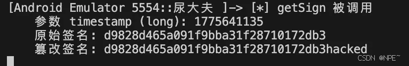 [*] getSign 被调用 参数 timestamp (long): 1775641135 原始签名: d9828d465a091f9bba31f28710172db3 篡改签名: d9828d465a091f9bba31f28710172db3hacked