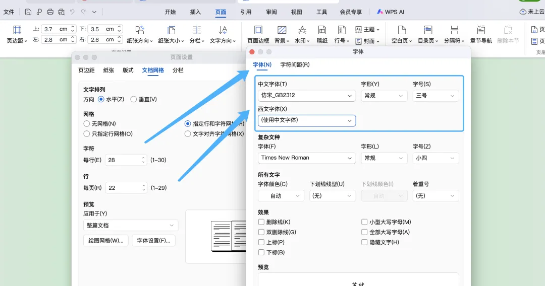接下来设置文档网格,字体设置为仿宋GB2312,字形是常规,字号是三号,西文字体勾选使用中文字体点击确定⬇️