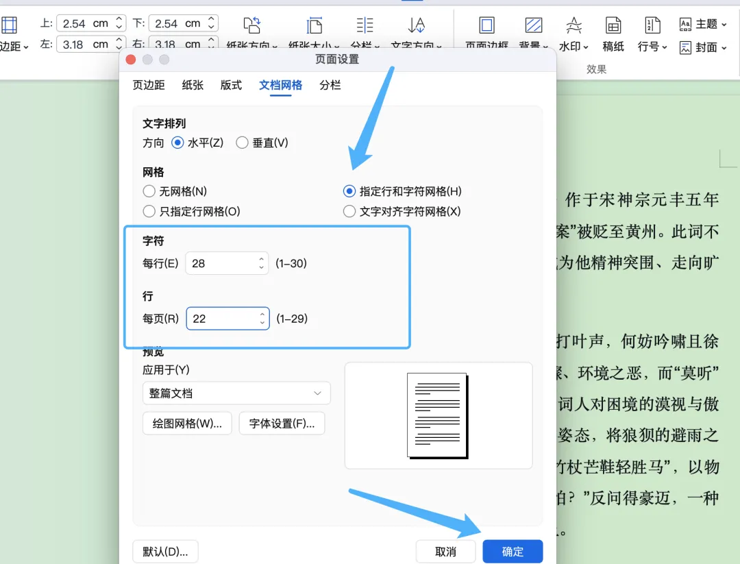 之后我们在设置,字行数每个页面排22行,每行排28个字⬇️