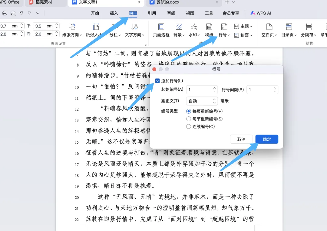 接下来我们可以单击页面,行号,行编号选项,添加行编号进行校验一下⬇️