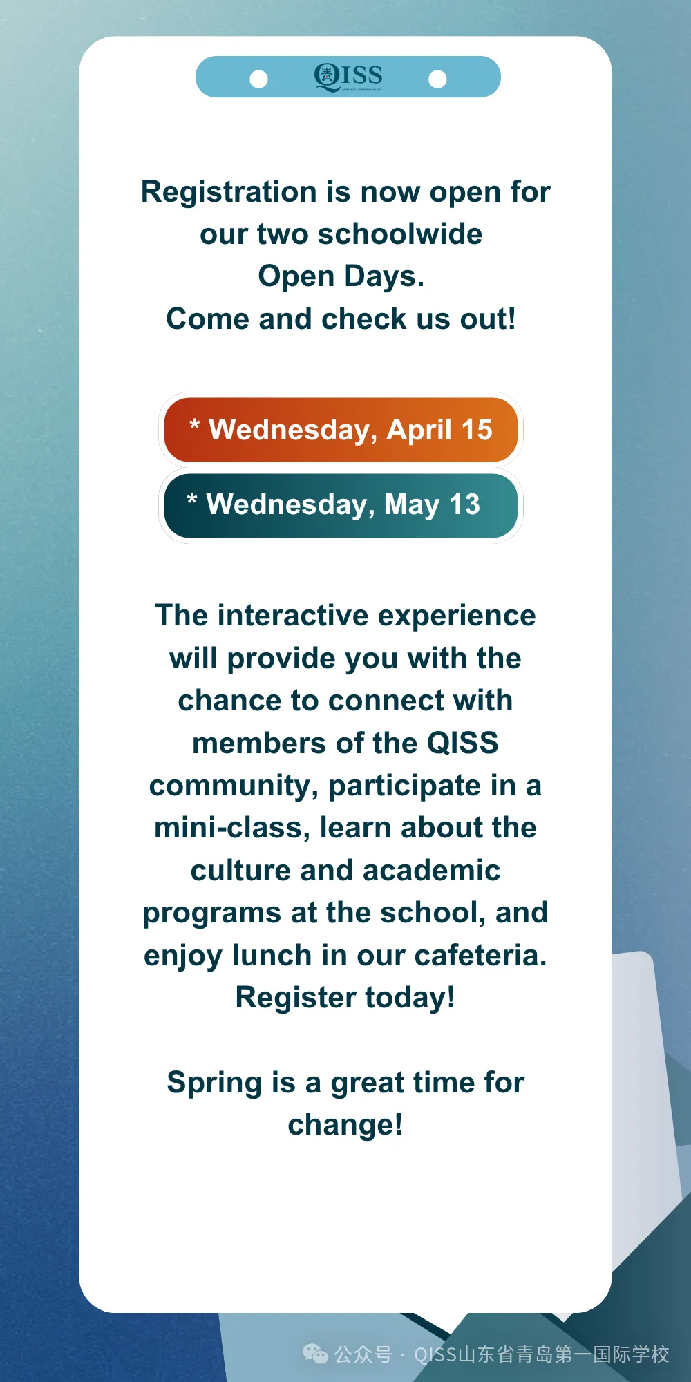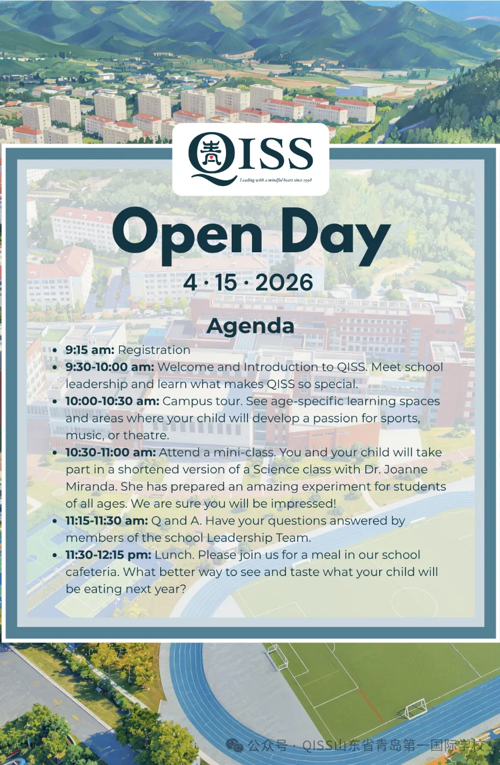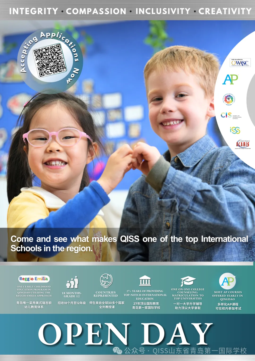来亲眼看看是什么让山东省青岛第一国际学校(QISS)成为该地区顶尖的国际学校之一。无论您是想为孩子寻找一所学校以完成2025-26学年的学业,还是为 2026-27学年开启全新的旅程,QISS招生办公室都将竭诚为您服务。