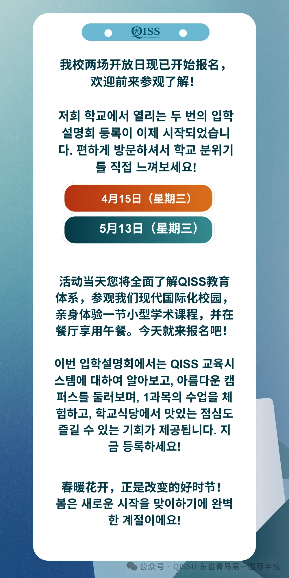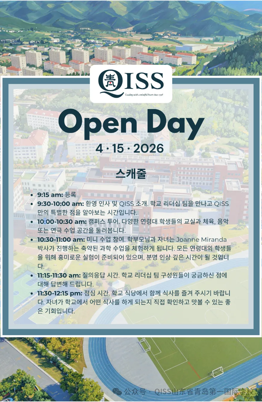 QISS가 이 지역 최고의 국제 학교 중 하나인 이유를 직접 경험해 보러 오세요! 2025-26 학년을 마치기 위해 새 학교를 찾고 계시든, 2026-27 학년을 위한 새로운 시작을 계획 중이시든, QISS 입학처가 따뜻하게 맞이하며 안내해 드립니다.