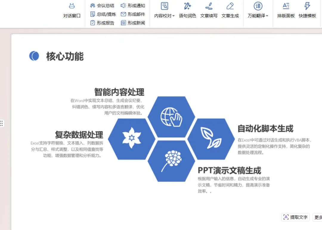最近发现一款Office和WPS的智能辅助工具,可对文档、表格进行大模型处理。支持文案提炼总结、内容校对、语句润色、文章续写、多语种翻译、一键排版、PPT生成等功能。