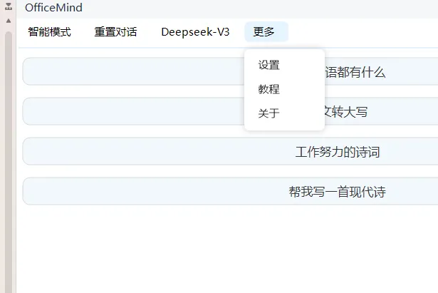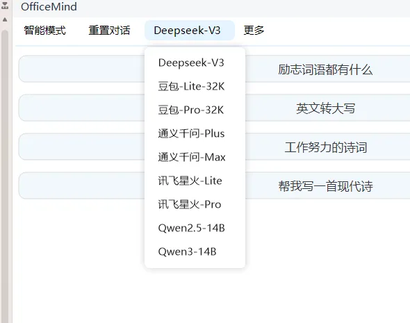 软件内置多种大语言模型,点击即可切换。不同模型擅长的事情不一样,写作用一个,翻译用另一个,按需切换。