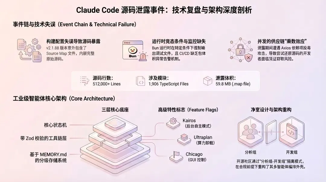 本章将对此次涉及约 51.2 万行 TypeScript 核心架构代码的泄露事件进行详尽的技术复盘。我们将分析构建产物(Artifacts)中的 .map 调试文件引发的数据暴露机制,探讨其与并发的包管理器供应链攻击之间的关联性,并回顾开源社区如何通过“净室设计(Clean Room Design)”进行合规的逆向工程重构。