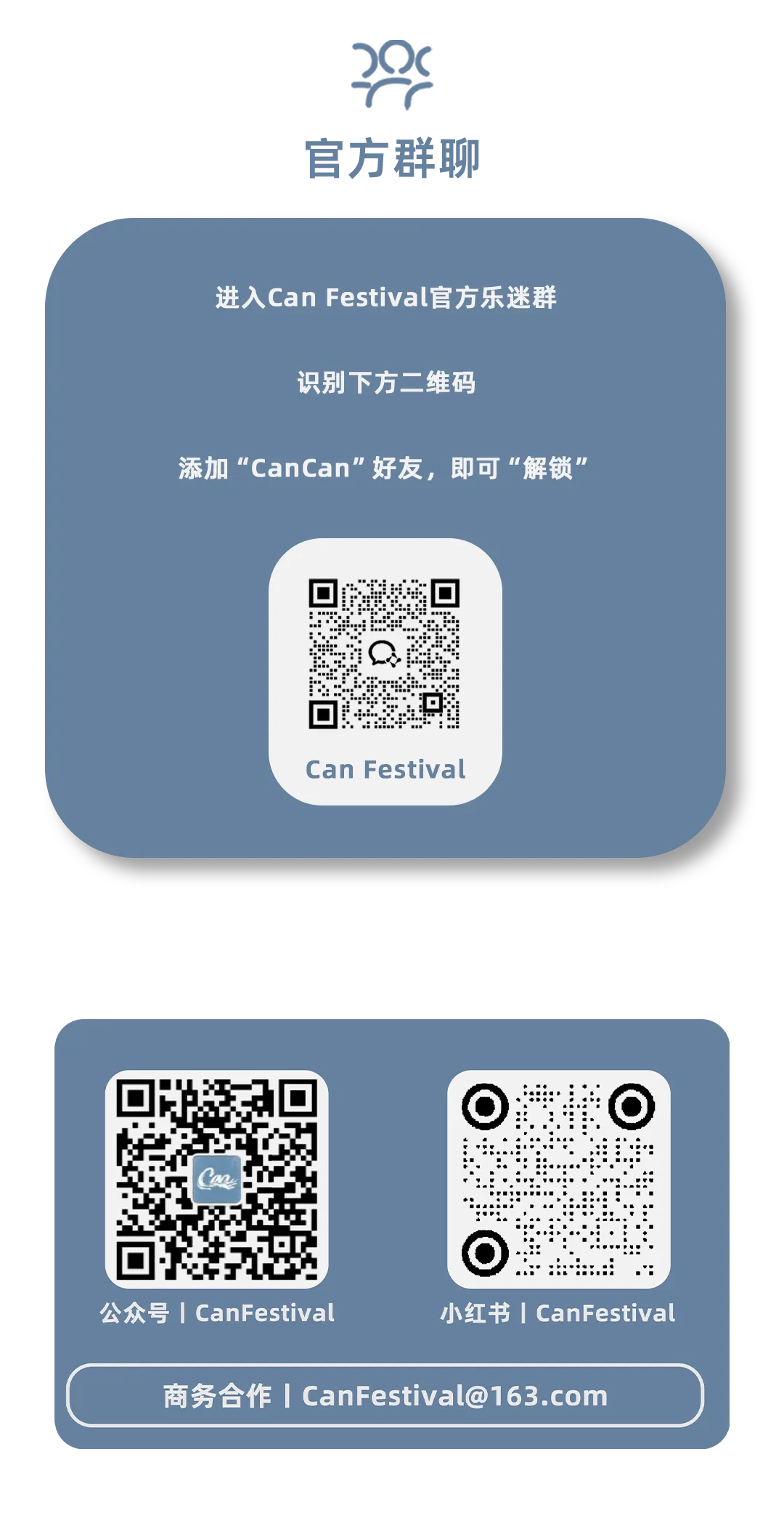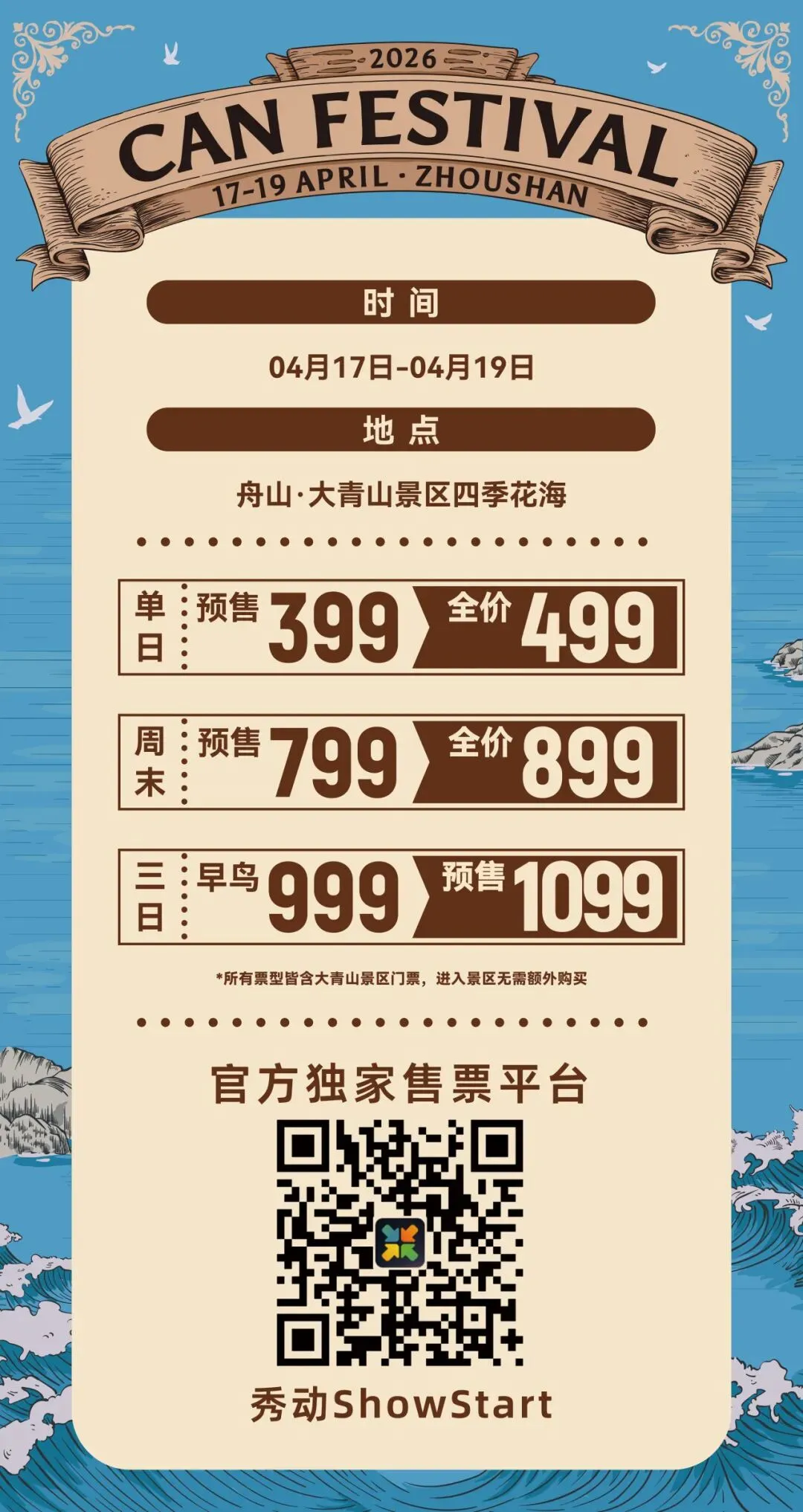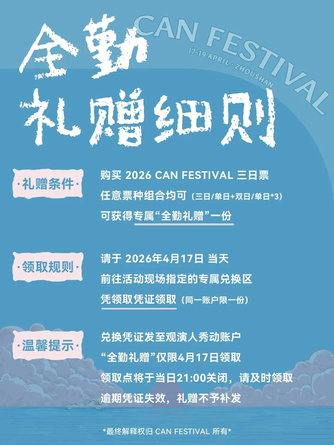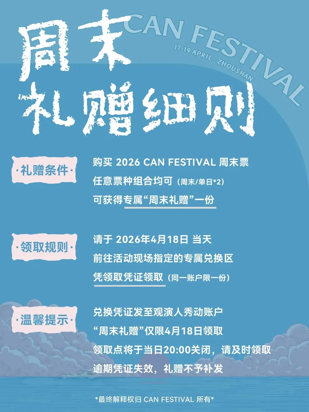 官方礼赠 领取说明丨2026 Can Festival 2026 CAN FESTIVAL 时间 / Time 2026年04月17日-04月19日 场地/ Venue 浙江省舟山市朱家尖大青山景区·四季花海 全勤礼赠 Can Festival 周末礼赠 Can Festival 如遇小程序无法微信支付 请至后台点击底部菜单「微店备用」即可支付 CANCAN 点击阅读原文 去购票