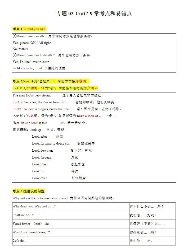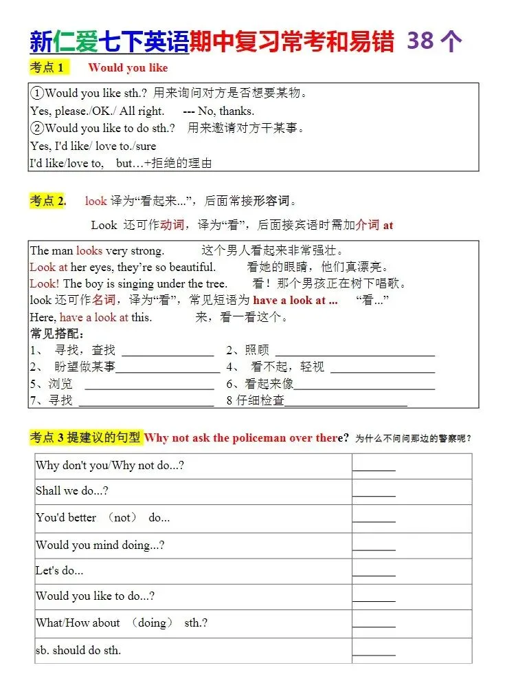小鹿老师今日分享:七年级下册仁爱版英语期中常考易错38个考点专练